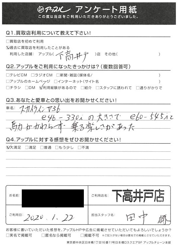 お車のご相談・ 査定だけでもOK! カンタン 入力 30秒 アップルがブランド買取始めました! お電話でも受付中! 受付時間10:00 ~ 19:00 0120-037-315 お車のご相談・ 査定だけでもOK! カンタン 入力 30秒 アップルがブランド買取始めました! お電話でも受付中! 受付時間10:00 ~ 19:00 0120-037-315 アップルがブランド買取始めました! お電話でも受付中! 受付時間10:00 ~ 19:00 0120-037-315 店舗情報 在庫車 スタッフ紹介 ブログ お客様の声 キャンペーン お得 無料査定 click お客様の声 ご記入日: 2020/03/03 東京都新宿区 ご利用日:2020/1/19 I様 車名:日産 スカイライン(セダン) Q あなたと愛車との思い出をお聞かせください! e46-330i の大きさで e60-545iと 馬力がかわらず乗る楽しさがあった 前へ 次へ お客様の声一覧を見る