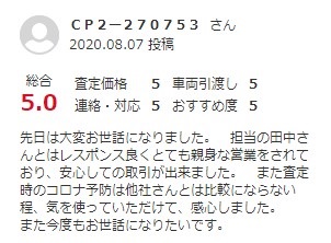 先日は大変お世話になりました。 担当の田中さんとはレスポンス良くとても親身な営業をされており、安心しての取引が出来ました。 また査定時のコロナ予防は他社さんとは比較にならない程、気を使っていただけて、感心しました。