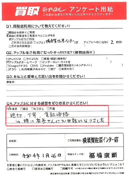 お車のご相談・ 査定だけでもOK! カンタン 入力 30秒 アップルがブランド買取始めました! お電話でも受付中! 受付時間9:30 ~ 18:30 046-833-8881 お車のご相談・ 査定だけでもOK! カンタン 入力 30秒 アップルがブランド買取始めました! お電話でも受付中! 受付時間9:30 ~ 18:30 046-833-8881 アップルがブランド買取始めました! お電話でも受付中! 受付時間9:30 ~ 18:30 046-833-8881 店舗情報 在庫車 スタッフ紹介 ブログ お客様の声 キャンペーン お得 無料査定 click お客様の声 ご記入日: 2022/03/26 N様 車名:ホンダ N-ONE 満足度★★★★★親切、丁寧、買取価格特に店長さんにお世話になりました。 前へ 次へ お客様の声一覧を見る