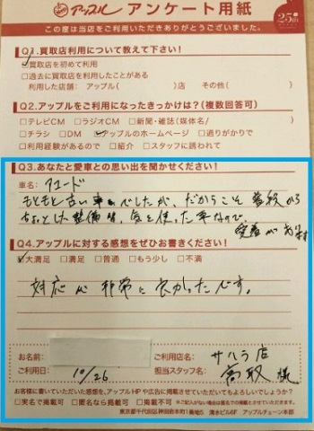 お車のご相談・ 査定だけでもOK! カンタン 入力 30秒 アップルがブランド買取始めました! お電話でも受付中! 受付時間9:30 ~ 18:30 046-833-8881 お車のご相談・ 査定だけでもOK! カンタン 入力 30秒 アップルがブランド買取始めました! お電話でも受付中! 受付時間9:30 ~ 18:30 046-833-8881 アップルがブランド買取始めました! お電話でも受付中! 受付時間9:30 ~ 18:30 046-833-8881 店舗情報 在庫車 スタッフ紹介 ブログ お客様の声 キャンペーン お得 無料査定 click お客様の声 ご記入日: 2014/10/26 T・K様 ■ご利用日時■ H26年10月26日■車種■ アコード■担当者■ 高取【アップルに対する感想をぜひお書きください】満足度★★★★★対応が非常に良かったです。 前へ 次へ お客様の声一覧を見る