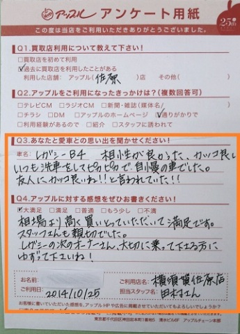 お車のご相談・ 査定だけでもOK! カンタン 入力 30秒 アップルがブランド買取始めました! お電話でも受付中! 受付時間9:30 ~ 18:30 046-833-8881 お車のご相談・ 査定だけでもOK! カンタン 入力 30秒 アップルがブランド買取始めました! お電話でも受付中! 受付時間9:30 ~ 18:30 046-833-8881 アップルがブランド買取始めました! お電話でも受付中! 受付時間9:30 ~ 18:30 046-833-8881 店舗情報 在庫車 スタッフ紹介 ブログ お客様の声 キャンペーン お得 無料査定 click お客様の声 ご記入日: 2014/10/25 S・T様 ■ご利用日時■ H26年10月25日■車種■ レガシィB4■担当者■ 田村【アップルに対する感想をぜひお書きください】満足度★★★★★相場より高く買い取っていただいて満足です。スタッフさんも親切でした。レガシィの次のオーナーさん 大切に乗って下さる方にゆずってくださいね! 前へ 次へ お客様の声一覧を見る