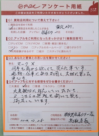 お車のご相談・ 査定だけでもOK! カンタン 入力 30秒 アップルがブランド買取始めました! お電話でも受付中! 受付時間9:30 ~ 18:30 046-833-8881 お車のご相談・ 査定だけでもOK! カンタン 入力 30秒 アップルがブランド買取始めました! お電話でも受付中! 受付時間9:30 ~ 18:30 046-833-8881 アップルがブランド買取始めました! お電話でも受付中! 受付時間9:30 ~ 18:30 046-833-8881 店舗情報 在庫車 スタッフ紹介 ブログ お客様の声 キャンペーン お得 無料査定 click お客様の声 ご記入日: 2014/10/25 N・Y様 ■ご利用日時■ H26年10月25日■車種■ マークX■担当者■ 高取店長【アップルに対する感想をぜひお書きください】満足度★★★★大変親切に対応していただき 又こちらの無理も聞いて頂き満足しています。 前へ 次へ お客様の声一覧を見る