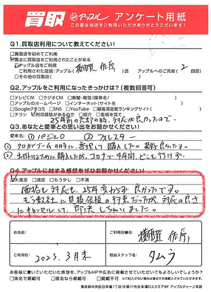 お車のご相談・ 査定だけでもOK! カンタン 入力 30秒 アップルがブランド買取始めました! お電話でも受付中! 受付時間9:30 ~ 18:30 046-833-8881 お車のご相談・ 査定だけでもOK! カンタン 入力 30秒 アップルがブランド買取始めました! お電話でも受付中! 受付時間9:30 ~ 18:30 046-833-8881 アップルがブランド買取始めました! お電話でも受付中! 受付時間9:30 ~ 18:30 046-833-8881 店舗情報 在庫車 スタッフ紹介 ブログ お客様の声 キャンペーン お得 無料査定 click お客様の声 ご記入日: 2023/03/31 S様 車名:三菱 パジェロ 満足度★★★★★価格も対応も、25年変わらず良かったです。もう数社に見積依頼の約束だったが、対応の良さにキャンセルして即決しちゃいました。 前へ 次へ お客様の声一覧を見る