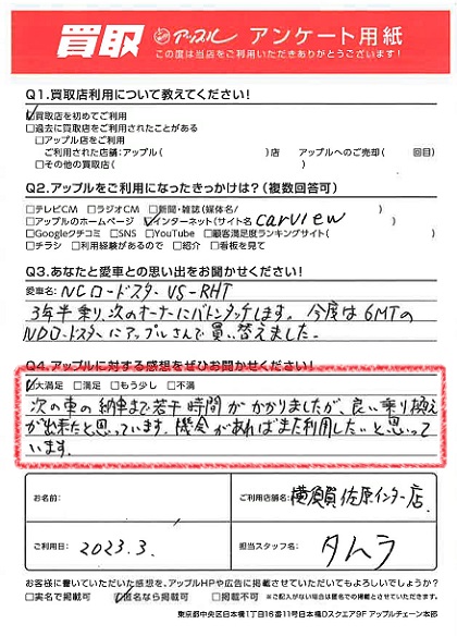 お車のご相談・ 査定だけでもOK! カンタン 入力 30秒 アップルがブランド買取始めました! お電話でも受付中! 受付時間9:30 ~ 18:30 046-833-8881 お車のご相談・ 査定だけでもOK! カンタン 入力 30秒 アップルがブランド買取始めました! お電話でも受付中! 受付時間9:30 ~ 18:30 046-833-8881 アップルがブランド買取始めました! お電話でも受付中! 受付時間9:30 ~ 18:30 046-833-8881 店舗情報 在庫車 スタッフ紹介 ブログ お客様の声 キャンペーン お得 無料査定 click お客様の声 ご記入日: 2023/03/25 S様 車名:マツダ ロードスター 満足度★★★★★次の車の納車まで若干時間がかかりましたが、良い乗り換えができたと思っています。機会があればまた利用したいと思っています。 前へ 次へ お客様の声一覧を見る