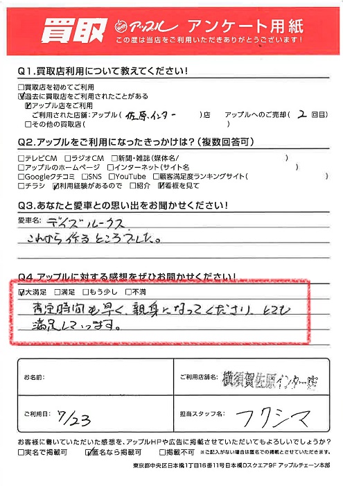 お車のご相談・ 査定だけでもOK! カンタン 入力 30秒 アップルがブランド買取始めました! お電話でも受付中! 受付時間9:30 ~ 18:30 046-833-8881 お車のご相談・ 査定だけでもOK! カンタン 入力 30秒 アップルがブランド買取始めました! お電話でも受付中! 受付時間9:30 ~ 18:30 046-833-8881 アップルがブランド買取始めました! お電話でも受付中! 受付時間9:30 ~ 18:30 046-833-8881 店舗情報 在庫車 スタッフ紹介 ブログ お客様の声 キャンペーン お得 無料査定 click お客様の声 ご記入日: 2023/07/23 H様 車名:日産 デイズルークス 満足度★★★★★査定時間も早く、親身になってくださり、とても満足しています。 前へ 次へ お客様の声一覧を見る