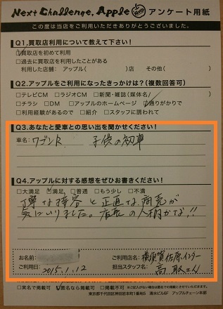 お車のご相談・ 査定だけでもOK! カンタン 入力 30秒 アップルがブランド買取始めました! お電話でも受付中! 受付時間9:30 ~ 18:30 046-833-8881 お車のご相談・ 査定だけでもOK! カンタン 入力 30秒 アップルがブランド買取始めました! お電話でも受付中! 受付時間9:30 ~ 18:30 046-833-8881 アップルがブランド買取始めました! お電話でも受付中! 受付時間9:30 ~ 18:30 046-833-8881 店舗情報 在庫車 スタッフ紹介 ブログ お客様の声 キャンペーン お得 無料査定 click お客様の声 ご記入日: 2015/01/12 N・S様 ■ご利用日時■ H27年1月12日■車種■ ワゴンR■担当者■ 高取【アップルに対する感想をぜひお書きください】満足度★★★★丁寧な接客と正直な商売が気に入りました。店長の人柄かな・・・ 前へ 次へ お客様の声一覧を見る