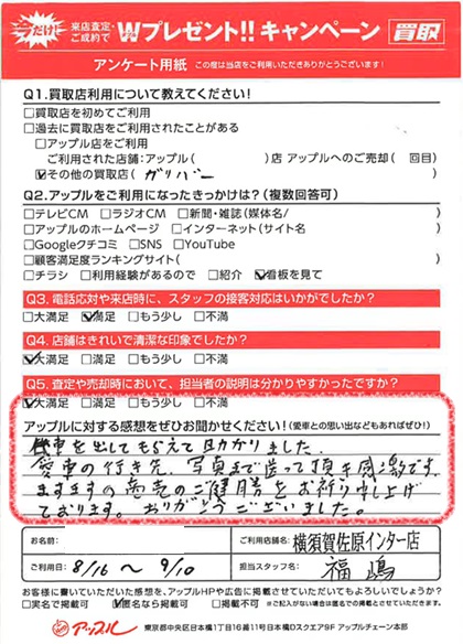 お車のご相談・ 査定だけでもOK! カンタン 入力 30秒 アップルがブランド買取始めました! お電話でも受付中! 受付時間9:30 ~ 18:30 046-833-8881 お車のご相談・ 査定だけでもOK! カンタン 入力 30秒 アップルがブランド買取始めました! お電話でも受付中! 受付時間9:30 ~ 18:30 046-833-8881 アップルがブランド買取始めました! お電話でも受付中! 受付時間9:30 ~ 18:30 046-833-8881 店舗情報 在庫車 スタッフ紹介 ブログ お客様の声 キャンペーン お得 無料査定 click お客様の声 ご記入日: 2023/08/16 N様 車名:スバル フォレスター 満足度★★★★★代車を出してもらえて助かりました。愛車の行き先、写真まで送って頂き感激です。ますますの商売のご健勝をお祈り申し上げております。ありがとうございました。 前へ 次へ お客様の声一覧を見る