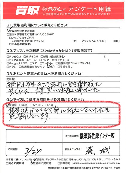 お車のご相談・ 査定だけでもOK! カンタン 入力 30秒 アップルがブランド買取始めました! お電話でも受付中! 受付時間9:30 ~ 18:30 046-833-8881 お車のご相談・ 査定だけでもOK! カンタン 入力 30秒 アップルがブランド買取始めました! お電話でも受付中! 受付時間9:30 ~ 18:30 046-833-8881 アップルがブランド買取始めました! お電話でも受付中! 受付時間9:30 ~ 18:30 046-833-8881 店舗情報 在庫車 スタッフ紹介 ブログ お客様の声 キャンペーン お得 無料査定 click お客様の声 ご記入日: 2024/03/24 H様 車名:トヨタ エスティマ 満足度★★★★★ 担当の方がとても丁寧に対応していただき、感謝しています。 前へ 次へ お客様の声一覧を見る