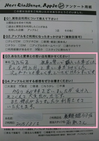 お車のご相談・ 査定だけでもOK! カンタン 入力 30秒 アップルがブランド買取始めました! お電話でも受付中! 受付時間9:30 ~ 18:30 046-833-8881 お車のご相談・ 査定だけでもOK! カンタン 入力 30秒 アップルがブランド買取始めました! お電話でも受付中! 受付時間9:30 ~ 18:30 046-833-8881 アップルがブランド買取始めました! お電話でも受付中! 受付時間9:30 ~ 18:30 046-833-8881 店舗情報 在庫車 スタッフ紹介 ブログ お客様の声 キャンペーン お得 無料査定 click お客様の声 ご記入日: 2015/03/01 T・T様 ■ご利用日時■ H27年3月1日■車種■ フェアレディZ■担当者■ 高取【アップルに対する感想をぜひお書きください】満足度★★★★かなりわがままを言いましたが 受け入れてくれて大変良かったですまた機会がありましたら利用させていただきます。 前へ 次へ お客様の声一覧を見る