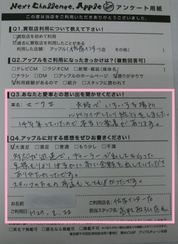 お車のご相談・ 査定だけでもOK! カンタン 入力 30秒 アップルがブランド買取始めました! お電話でも受付中! 受付時間9:30 ~ 18:30 046-833-8881 お車のご相談・ 査定だけでもOK! カンタン 入力 30秒 アップルがブランド買取始めました! お電話でも受付中! 受付時間9:30 ~ 18:30 046-833-8881 アップルがブランド買取始めました! お電話でも受付中! 受付時間9:30 ~ 18:30 046-833-8881 店舗情報 在庫車 スタッフ紹介 ブログ お客様の声 キャンペーン お得 無料査定 click お客様の声 ご記入日: 2015/02/22 N・S様 ■ご利用日時■ H27年2月22日■車種■ マーク2■担当者■ 高取店長【アップルに対する感想をぜひお書きください】満足度★★★★★対応が迅速で ディーラーで出してもらった見積もりよりはるかに高い金額を出していただきありがたかったですスタッフの方の接遇もとても良かったです。 前へ 次へ お客様の声一覧を見る