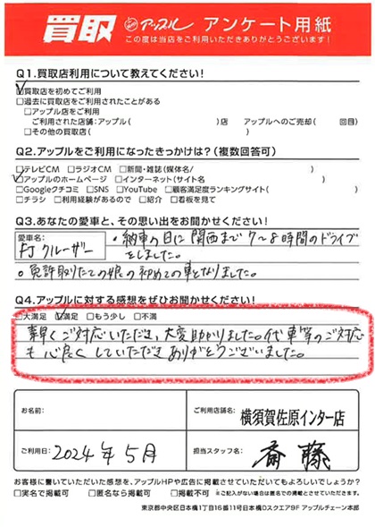 お車のご相談・ 査定だけでもOK! カンタン 入力 30秒 アップルがブランド買取始めました! お電話でも受付中! 受付時間9:30 ~ 18:30 046-833-8881 お車のご相談・ 査定だけでもOK! カンタン 入力 30秒 アップルがブランド買取始めました! お電話でも受付中! 受付時間9:30 ~ 18:30 046-833-8881 アップルがブランド買取始めました! お電話でも受付中! 受付時間9:30 ~ 18:30 046-833-8881 店舗情報 在庫車 スタッフ紹介 ブログ お客様の声 キャンペーン お得 無料査定 click お客様の声 ご記入日: 2024/04/14 U様 車名:トヨタ FJクルーザー(国内モデル 右H) 満足度★★★★素早くご対応いただき、大変助かりました。代車等のご対応も心良くしていただきありがとうございました。 前へ 次へ お客様の声一覧を見る