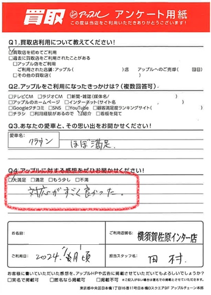 お車のご相談・ 査定だけでもOK! カンタン 入力 30秒 アップルがブランド買取始めました! お電話でも受付中! 受付時間9:30 ~ 18:30 046-833-8881 お車のご相談・ 査定だけでもOK! カンタン 入力 30秒 アップルがブランド買取始めました! お電話でも受付中! 受付時間9:30 ~ 18:30 046-833-8881 アップルがブランド買取始めました! お電話でも受付中! 受付時間9:30 ~ 18:30 046-833-8881 店舗情報 在庫車 スタッフ紹介 ブログ お客様の声 キャンペーン お得 無料査定 click お客様の声 ご記入日: 2024/07/27 T様 車名:トヨタ クラウン(~H11年8月/H30年6月~) 満足度★★★★★対応がすごく良かった。 前へ 次へ お客様の声一覧を見る