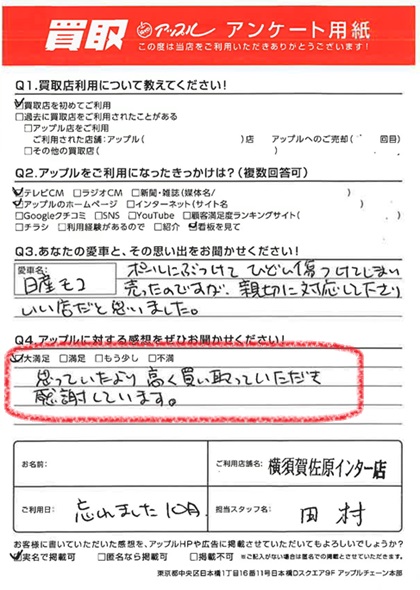 お車のご相談・ 査定だけでもOK! カンタン 入力 30秒 アップルがブランド買取始めました! お電話でも受付中! 受付時間9:30 ~ 18:30 046-833-8881 お車のご相談・ 査定だけでもOK! カンタン 入力 30秒 アップルがブランド買取始めました! お電話でも受付中! 受付時間9:30 ~ 18:30 046-833-8881 アップルがブランド買取始めました! お電話でも受付中! 受付時間9:30 ~ 18:30 046-833-8881 店舗情報 在庫車 スタッフ紹介 ブログ お客様の声 キャンペーン お得 無料査定 click お客様の声 ご記入日: 2024/10/02 I様 車名:日産 モコ 満足度★★★★★ 思っていたより、高く買い取っていただき感謝しています。 前へ 次へ お客様の声一覧を見る