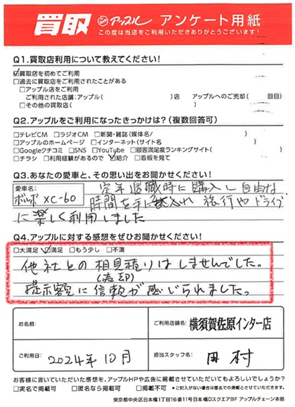 お車のご相談・ 査定だけでもOK! カンタン 入力 30秒 アップルがブランド買取始めました! お電話でも受付中! 受付時間9:30 ~ 18:30 046-833-8881 お車のご相談・ 査定だけでもOK! カンタン 入力 30秒 アップルがブランド買取始めました! お電話でも受付中! 受付時間9:30 ~ 18:30 046-833-8881 アップルがブランド買取始めました! お電話でも受付中! 受付時間9:30 ~ 18:30 046-833-8881 店舗情報 在庫車 スタッフ紹介 ブログ お客様の声 キャンペーン お得 無料査定 click お客様の声 ご記入日: 2024/10/13 K様 車名:ボルボ XC60 満足度★★★★他社との相見積もり(売却)はしませんでした。提示額に信頼が感じられました。 前へ 次へ お客様の声一覧を見る