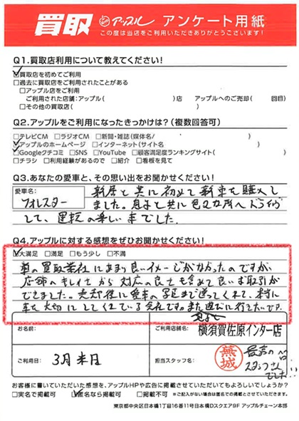 お車のご相談・ 査定だけでもOK! カンタン 入力 30秒 アップルがブランド買取始めました! お電話でも受付中! 受付時間9:30 ~ 18:30 046-833-8881 お車のご相談・ 査定だけでもOK! カンタン 入力 30秒 アップルがブランド買取始めました! お電話でも受付中! 受付時間9:30 ~ 18:30 046-833-8881 アップルがブランド買取始めました! お電話でも受付中! 受付時間9:30 ~ 18:30 046-833-8881 店舗情報 在庫車 スタッフ紹介 ブログ お客様の声 キャンペーン お得 無料査定 click お客様の声 ご記入日: 2025/03/29 N様 車名:スバル フォレスター 満足度★★★★★ 車の買取業社にあまり良いイメージがなかったのですが店舗のキレイさから対応の良さも含めて、良いお取引ができました。売却後に愛車の写真まで送ってくれて、本当に車を大切にしてくれている会社です。また見ると遊びに行きたいです。 前へ 次へ お客様の声一覧を見る