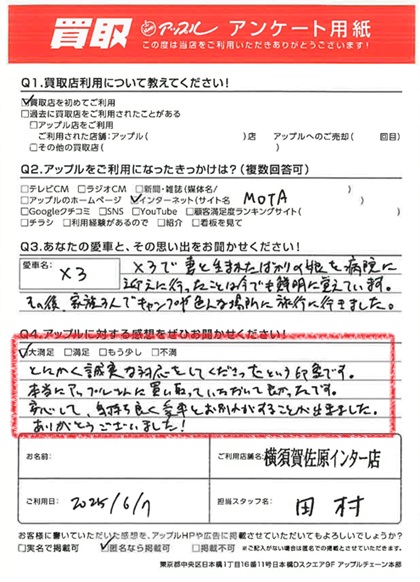 お車のご相談・ 査定だけでもOK! カンタン 入力 30秒 アップルがブランド買取始めました! お電話でも受付中! 受付時間9:30 ~ 18:30 046-833-8881 お車のご相談・ 査定だけでもOK! カンタン 入力 30秒 アップルがブランド買取始めました! お電話でも受付中! 受付時間9:30 ~ 18:30 046-833-8881 アップルがブランド買取始めました! お電話でも受付中! 受付時間9:30 ~ 18:30 046-833-8881 店舗情報 在庫車 スタッフ紹介 ブログ お客様の声 キャンペーン お得 無料査定 click お客様の声 ご記入日: 2025/06/07 N様 車名:BMW X3 満足度★★★★★ とにかく誠実な対応をして下さったという印象です。本当にアップルさんに買い取っていただいて良かったです。安心して、気持ち良く愛車とお別れすることができました。ありがとうございました! 前へ 次へ お客様の声一覧を見る