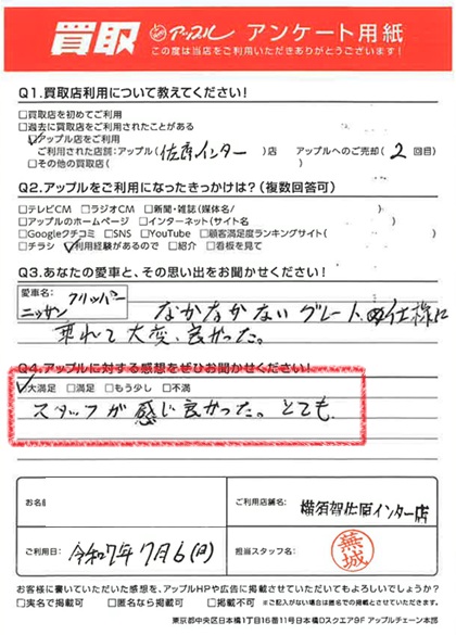 お車のご相談・ 査定だけでもOK! カンタン 入力 30秒 アップルがブランド買取始めました! お電話でも受付中! 受付時間9:30 ~ 18:30 046-833-8881 お車のご相談・ 査定だけでもOK! カンタン 入力 30秒 アップルがブランド買取始めました! お電話でも受付中! 受付時間9:30 ~ 18:30 046-833-8881 アップルがブランド買取始めました! お電話でも受付中! 受付時間9:30 ~ 18:30 046-833-8881 店舗情報 在庫車 スタッフ紹介 ブログ お客様の声 キャンペーン お得 無料査定 click お客様の声 ご記入日: 2025/07/06 H様 車名:日産 クリッパー 満足度★★★★★スタッフが感じ良かった、とても。 前へ 次へ お客様の声一覧を見る