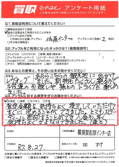 お車のご相談・ 査定だけでもOK! カンタン 入力 30秒 アップルがブランド買取始めました! お電話でも受付中! 受付時間9:30 ~ 18:30 046-833-8881 お車のご相談・ 査定だけでもOK! カンタン 入力 30秒 アップルがブランド買取始めました! お電話でも受付中! 受付時間9:30 ~ 18:30 046-833-8881 アップルがブランド買取始めました! お電話でも受付中! 受付時間9:30 ~ 18:30 046-833-8881 店舗情報 在庫車 スタッフ紹介 ブログ お客様の声 キャンペーン お得 無料査定 click お客様の声 ご記入日: 2025/08/27 F様 車名:スバル レヴォーグ 満足度★★★★★査定金額を気持ちよく提示していただけて、すぐに決めることができました。とてもスピーディーに売却することができ、入金も早く気持ちよく車とさよならできました。 前へ 次へ お客様の声一覧を見る