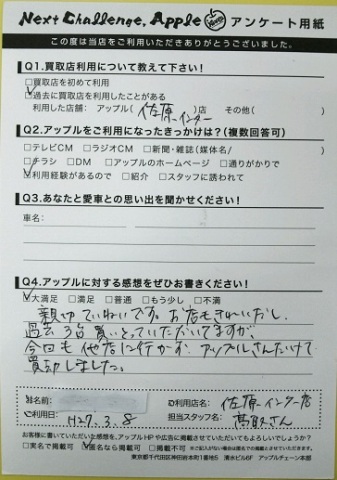 お車のご相談・ 査定だけでもOK! カンタン 入力 30秒 アップルがブランド買取始めました! お電話でも受付中! 受付時間9:30 ~ 18:30 046-833-8881 お車のご相談・ 査定だけでもOK! カンタン 入力 30秒 アップルがブランド買取始めました! お電話でも受付中! 受付時間9:30 ~ 18:30 046-833-8881 アップルがブランド買取始めました! お電話でも受付中! 受付時間9:30 ~ 18:30 046-833-8881 店舗情報 在庫車 スタッフ紹介 ブログ お客様の声 キャンペーン お得 無料査定 click お客様の声 ご記入日: 2015/03/08 K様 ■ご利用日時■ H27年3月8日■車種■ ?■担当者■ 高取【アップルに対する感想をぜひお書きください】満足度★★★★★親切丁寧ですお店もキレイだし過去3台買い取っていただいてますが今回も他店に行かずアップルさんだけで売却しました。 前へ 次へ お客様の声一覧を見る