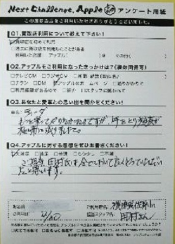 お車のご相談・ 査定だけでもOK! カンタン 入力 30秒 アップルがブランド買取始めました! お電話でも受付中! 受付時間9:30 ~ 18:30 046-833-8881 お車のご相談・ 査定だけでもOK! カンタン 入力 30秒 アップルがブランド買取始めました! お電話でも受付中! 受付時間9:30 ~ 18:30 046-833-8881 アップルがブランド買取始めました! お電話でも受付中! 受付時間9:30 ~ 18:30 046-833-8881 店舗情報 在庫車 スタッフ紹介 ブログ お客様の声 キャンペーン お得 無料査定 click お客様の声 ご記入日: 2015/04/30 K様 ■ご利用日時■ H27年4月30日■車種■ ティーダ■担当者■ 田村【アップルに対する感想をぜひお書きください】満足度★★★★★ご担当田村氏はすべてにおいて良くやっていただいたと思います。 前へ 次へ お客様の声一覧を見る