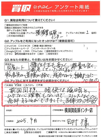 お車のご相談・ 査定だけでもOK! カンタン 入力 30秒 アップルがブランド買取始めました! お電話でも受付中! 受付時間9:30 ~ 18:30 046-833-8881 お車のご相談・ 査定だけでもOK! カンタン 入力 30秒 アップルがブランド買取始めました! お電話でも受付中! 受付時間9:30 ~ 18:30 046-833-8881 アップルがブランド買取始めました! お電話でも受付中! 受付時間9:30 ~ 18:30 046-833-8881 店舗情報 在庫車 スタッフ紹介 ブログ お客様の声 キャンペーン お得 無料査定 click お客様の声 ご記入日: 2025/09/22 K様 車名:日産 ノート 満足度★★★★前回同様、明快な説明と、ムダな心理戦もないので、ストレスなく売却することができました。店舗スタッフも◎ 前へ 次へ お客様の声一覧を見る
