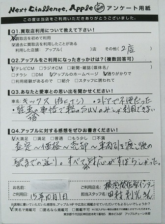 お車のご相談・ 査定だけでもOK! カンタン 入力 30秒 アップルがブランド買取始めました! お電話でも受付中! 受付時間9:30 ~ 18:30 046-833-8881 お車のご相談・ 査定だけでもOK! カンタン 入力 30秒 アップルがブランド買取始めました! お電話でも受付中! 受付時間9:30 ~ 18:30 046-833-8881 アップルがブランド買取始めました! お電話でも受付中! 受付時間9:30 ~ 18:30 046-833-8881 店舗情報 在庫車 スタッフ紹介 ブログ お客様の声 キャンペーン お得 無料査定 click お客様の声 ご記入日: 2015/10/01 H・H様 ■ご利用日時■ H27 年10月1日■車種■ キックス■担当者■ 田村【アップルに対する感想をぜひお書きください】満足度★★★★★査定~価格~売却~車両引き渡し後の駅までの送り。すべての対応がすばらしかった。 前へ 次へ お客様の声一覧を見る