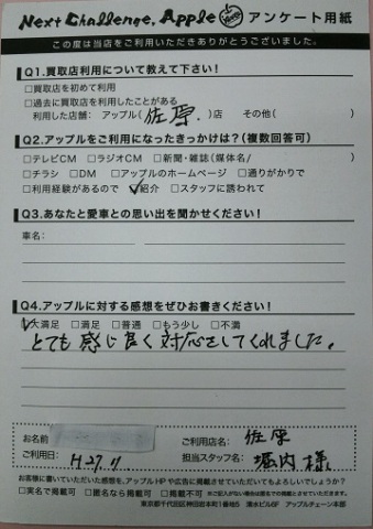 お車のご相談・ 査定だけでもOK! カンタン 入力 30秒 アップルがブランド買取始めました! お電話でも受付中! 受付時間9:30 ~ 18:30 046-833-8881 お車のご相談・ 査定だけでもOK! カンタン 入力 30秒 アップルがブランド買取始めました! お電話でも受付中! 受付時間9:30 ~ 18:30 046-833-8881 アップルがブランド買取始めました! お電話でも受付中! 受付時間9:30 ~ 18:30 046-833-8881 店舗情報 在庫車 スタッフ紹介 ブログ お客様の声 キャンペーン お得 無料査定 click お客様の声 ご記入日: 2015/11/25 O・N様 ■ご利用日時■ H27 年11月25日■車種■ イスト■担当者■ 堀内【アップルに対する感想をぜひお書きください】満足度★★★★★とても感じ良く対応をしてくれました。 前へ 次へ お客様の声一覧を見る
