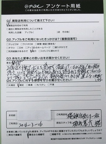 お車のご相談・ 査定だけでもOK! カンタン 入力 30秒 アップルがブランド買取始めました! お電話でも受付中! 受付時間9:30 ~ 18:30 046-833-8881 お車のご相談・ 査定だけでもOK! カンタン 入力 30秒 アップルがブランド買取始めました! お電話でも受付中! 受付時間9:30 ~ 18:30 046-833-8881 アップルがブランド買取始めました! お電話でも受付中! 受付時間9:30 ~ 18:30 046-833-8881 店舗情報 在庫車 スタッフ紹介 ブログ お客様の声 キャンペーン お得 無料査定 click お客様の声 ご記入日: 2016/03/16 M・M様 ■ご利用日時■ H28年3月16日■車種■ BMW■担当者■ 堀内【アップルに対する感想をぜひお書きください】満足度★★★★★ 前へ 次へ お客様の声一覧を見る