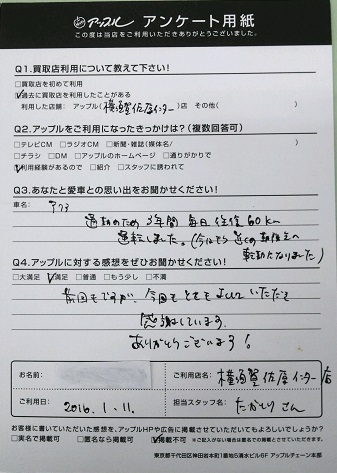 お車のご相談・ 査定だけでもOK! カンタン 入力 30秒 アップルがブランド買取始めました! お電話でも受付中! 受付時間9:30 ~ 18:30 046-833-8881 お車のご相談・ 査定だけでもOK! カンタン 入力 30秒 アップルがブランド買取始めました! お電話でも受付中! 受付時間9:30 ~ 18:30 046-833-8881 アップルがブランド買取始めました! お電話でも受付中! 受付時間9:30 ~ 18:30 046-833-8881 店舗情報 在庫車 スタッフ紹介 ブログ お客様の声 キャンペーン お得 無料査定 click お客様の声 ご記入日: 2016/01/11 T・N様 ■ご利用日時■ H28年1月11日■車種■ アクア■担当者■ 高取【アップルに対する感想をぜひお書きください】満足度★★★★★前回もですが 今回もとてもよくしていただき感謝していますありがとうございます。 前へ 次へ お客様の声一覧を見る