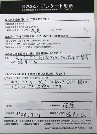 お車のご相談・ 査定だけでもOK! カンタン 入力 30秒 アップルがブランド買取始めました! お電話でも受付中! 受付時間9:30 ~ 18:30 046-833-8881 お車のご相談・ 査定だけでもOK! カンタン 入力 30秒 アップルがブランド買取始めました! お電話でも受付中! 受付時間9:30 ~ 18:30 046-833-8881 アップルがブランド買取始めました! お電話でも受付中! 受付時間9:30 ~ 18:30 046-833-8881 店舗情報 在庫車 スタッフ紹介 ブログ お客様の声 キャンペーン お得 無料査定 click お客様の声 ご記入日: 2016/03/09 K.T様 ■ご利用日時■ H28年3月9日■車種■ アルファード■担当者■ 高取【アップルに対する感想をぜひお書きください】満足度★★★★★他社よりも高く買い取ってもらい 親切にしていただき大満足です。 前へ 次へ お客様の声一覧を見る