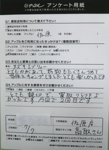 お車のご相談・ 査定だけでもOK! カンタン 入力 30秒 アップルがブランド買取始めました! お電話でも受付中! 受付時間9:30 ~ 18:30 046-833-8881 お車のご相談・ 査定だけでもOK! カンタン 入力 30秒 アップルがブランド買取始めました! お電話でも受付中! 受付時間9:30 ~ 18:30 046-833-8881 アップルがブランド買取始めました! お電話でも受付中! 受付時間9:30 ~ 18:30 046-833-8881 店舗情報 在庫車 スタッフ紹介 ブログ お客様の声 キャンペーン お得 無料査定 click お客様の声 ご記入日: 2016/07/07 S・M様 ■ご利用日時■ H28年07月07日■車種■ スズキエブリィ■担当者■ 高取【アップルに対する感想をぜひお書きください】満足度★★★★★とても親切で買取がとても良かったです今回で二回目です 前へ 次へ お客様の声一覧を見る