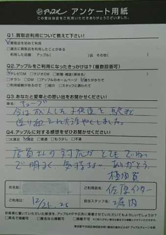 お車のご相談・ 査定だけでもOK! カンタン 入力 30秒 アップルがブランド買取始めました! お電話でも受付中! 受付時間9:30 ~ 18:30 046-833-8881 お車のご相談・ 査定だけでもOK! カンタン 入力 30秒 アップルがブランド買取始めました! お電話でも受付中! 受付時間9:30 ~ 18:30 046-833-8881 アップルがブランド買取始めました! お電話でも受付中! 受付時間9:30 ~ 18:30 046-833-8881 店舗情報 在庫車 スタッフ紹介 ブログ お客様の声 キャンペーン お得 無料査定 click お客様の声 ご記入日: 2016/12/25 O・M様 ■ご利用日時■ H28年12月25日■車種■ キューブ■担当者■ 堀内【アップルに対する感想をぜひお書きください】満足度★★★★★店員さんの対応がとても丁寧で明るく気持ちよい。ありがとう 前へ 次へ お客様の声一覧を見る