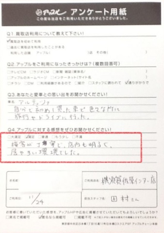 お車のご相談・ 査定だけでもOK! カンタン 入力 30秒 アップルがブランド買取始めました! お電話でも受付中! 受付時間9:30 ~ 18:30 046-833-8881 お車のご相談・ 査定だけでもOK! カンタン 入力 30秒 アップルがブランド買取始めました! お電話でも受付中! 受付時間9:30 ~ 18:30 046-833-8881 アップルがブランド買取始めました! お電話でも受付中! 受付時間9:30 ~ 18:30 046-833-8881 店舗情報 在庫車 スタッフ紹介 ブログ お客様の声 キャンペーン お得 無料査定 click お客様の声 ご記入日: 2017/11/24 G・K様 ■ご利用日時■ H 29 年 11 月 24 日■車種■ アルテッツァ■担当者■ 田村《アップルに対する感想をぜひお書きください》満足度★★★★接客が丁寧で、店内も明るく、居やすい環境でした。 前へ 次へ お客様の声一覧を見る