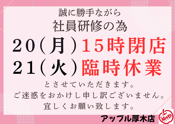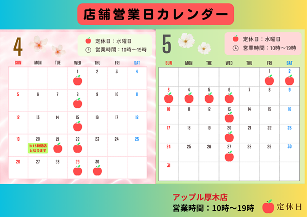 お車のご相談・ 査定だけでもOK! カンタン 入力 30秒 アップルがブランド買取始めました! お電話でも受付中! 受付時間10:00 ~ 19:00 046-246-2828 お車のご相談・ 査定だけでもOK! カンタン 入力 30秒 アップルがブランド買取始めました! お電話でも受付中! 受付時間10:00 ~ 19:00 046-246-2828 アップルがブランド買取始めました! お電話でも受付中! 受付時間10:00 ~ 19:00 046-246-2828 店舗情報 在庫車 スタッフ紹介 ブログ お客様の声 キャンペーン 無料査定 click [ つぶやき ] 2026/04/13 (月) 13:15 お知らせ 皆様こんにちは。本日はアップル厚木店からのお知らせとなります。4月、5月の営業日カレンダーは下記の通りとなります。ゴールデンウィーク休業日もございますがご来店やご相談等お気軽にご連絡下さい。 2026-04-13 13:15:15 新しい記事へ 古い記事へ 最新記事 ◆ゴールデンウィーク休業のお知らせ◆◆久しぶりの二人ランチ◆おしゃれなカフェに本日は・・・◆お散歩へ◆ 店舗情報に戻る 月別アーカイブ 2026年04月(12)2026年03月(11)2026年02月(18)2026年01月(18)2025年12月(10)2025年11月(9)2025年10月(12)2025年09月(10)2025年08月(10)2025年07月(5)2025年06月(5)2025年05月(11)2025年04月(12)2025年03月(15)2025年02月(13)2025年01月(16)2024年12月(7)2024年11月(8)2024年10月(7)2024年09月(9)2024年08月(6)2024年07月(11)2024年06月(9)2024年05月(7)2024年04月(15)2024年03月(10)2024年02月(7)2024年01月(8)2023年12月(3)2023年11月(7)2023年10月(8)2023年09月(9)2023年08月(9)2023年07月(11)2023年06月(3)2023年05月(7)2023年04月(4)2023年03月(7)2023年02月(5)2023年01月(14)2022年12月(6)2022年11月(7)2022年10月(11)2022年09月(9)2022年08月(10)2022年07月(16)2022年06月(15)2022年05月(11)2022年04月(8)2022年03月(7)2022年02月(5)2022年01月(9)2021年12月(9)2021年11月(10)2021年10月(11)2021年09月(9)2021年08月(10)2021年07月(10)2021年06月(10)2021年05月(9)2021年04月(11)2021年03月(5)2021年02月(7)2021年01月(4)2020年12月(5)2020年11月(6)2020年10月(6)2020年09月(6)2020年08月(9)2020年07月(6)2020年06月(7)2020年05月(6)2020年04月(5)2020年03月(7)2020年02月(7)2020年01月(10)2019年12月(7)2019年11月(8)2019年10月(8)2019年09月(9)2019年08月(8)2019年07月(12)2019年06月(8)2019年05月(8)2019年04月(8)2019年03月(7)2019年02月(8)2018年12月(11)2018年11月(10)2018年10月(10)2018年09月(16)2018年08月(14)2018年07月(16)2018年06月(15)2018年05月(14)2018年04月(12)2018年03月(10)2018年02月(10)2018年01月(11)2017年12月(5)2017年11月(8)2017年10月(6)2017年09月(8)2017年08月(25)2017年07月(13)2017年06月(13)2017年05月(10)2017年04月(8)2017年03月(6)2017年02月(8)2017年01月(8)2016年12月(7)2016年11月(10)2016年10月(12)2016年09月(12)2016年08月(24)2016年07月(4)2016年06月(6)2016年05月(3)2016年04月(7)2016年03月(7)2016年02月(5)2016年01月(7)2015年12月(6)2015年11月(5)2015年10月(3)2015年09月(8)2015年08月(9)2015年07月(9)2015年06月(8)2015年05月(8)2015年04月(11)2015年03月(8)2015年02月(8)2015年01月(7)2014年12月(7)2014年11月(8)2014年10月(11)2014年09月(11)2014年08月(11)2014年07月(9)2014年06月(13)2014年05月(12)2014年04月(7)2014年02月(1)2014年01月(2)2013年12月(1)2013年11月(1)2013年10月(1)2013年08月(2)