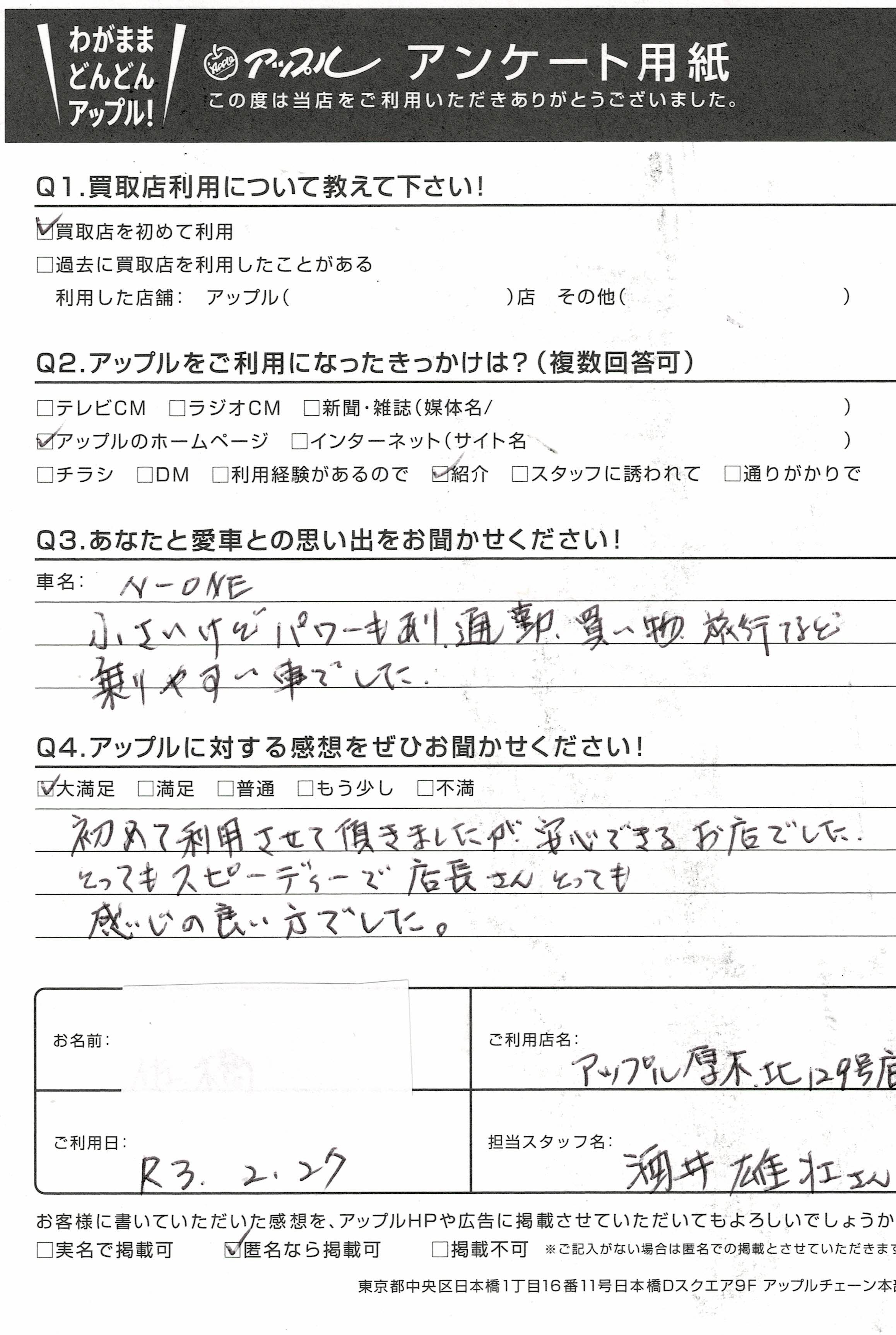 お車のご相談・ 査定だけでもOK! カンタン 入力 30秒 アップルがブランド買取始めました! お電話でも受付中! 受付時間10:00 ~ 19:00 046-246-2828 お車のご相談・ 査定だけでもOK! カンタン 入力 30秒 アップルがブランド買取始めました! お電話でも受付中! 受付時間10:00 ~ 19:00 046-246-2828 アップルがブランド買取始めました! お電話でも受付中! 受付時間10:00 ~ 19:00 046-246-2828 店舗情報 在庫車 スタッフ紹介 ブログ お客様の声 キャンペーン 無料査定 click お客様の声 ご記入日: 2021/02/27 S様 車名:ホンダ N-ONE 初めて利用させて頂きましたが、安心できるお店でした。とってもスピーディで店長さんとっても感じの良い方でした。 前へ 次へ お客様の声一覧を見る