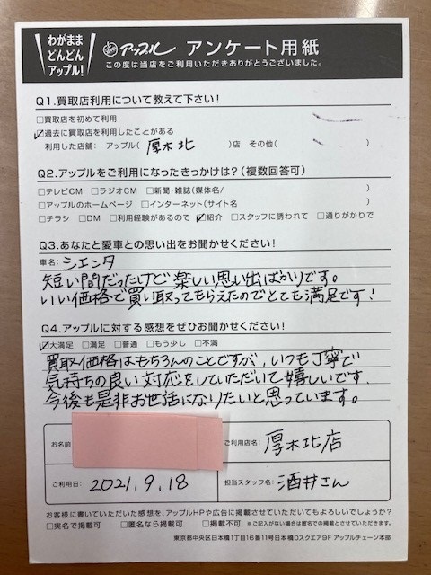 お車のご相談・ 査定だけでもOK! カンタン 入力 30秒 アップルがブランド買取始めました! お電話でも受付中! 受付時間10:00 ~ 19:00 046-246-2828 お車のご相談・ 査定だけでもOK! カンタン 入力 30秒 アップルがブランド買取始めました! お電話でも受付中! 受付時間10:00 ~ 19:00 046-246-2828 アップルがブランド買取始めました! お電話でも受付中! 受付時間10:00 ~ 19:00 046-246-2828 店舗情報 在庫車 スタッフ紹介 ブログ お客様の声 キャンペーン 無料査定 click お客様の声 ご記入日: 2021/09/18 神奈川県厚木市 K様 車名:トヨタ シエンタ 買取価格はもちろんのことですが、いつも丁寧で気持ちの良い対応をしていただいて嬉しいです。今後とも是非お世話になりたいと思っています。 前へ 次へ お客様の声一覧を見る