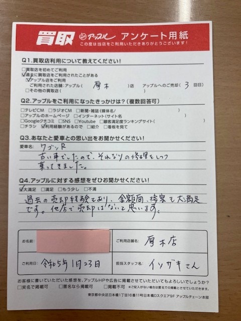 お車のご相談・ 査定だけでもOK! カンタン 入力 30秒 アップルがブランド買取始めました! お電話でも受付中! 受付時間10:00 ~ 19:00 046-246-2828 お車のご相談・ 査定だけでもOK! カンタン 入力 30秒 アップルがブランド買取始めました! お電話でも受付中! 受付時間10:00 ~ 19:00 046-246-2828 アップルがブランド買取始めました! お電話でも受付中! 受付時間10:00 ~ 19:00 046-246-2828 店舗情報 在庫車 スタッフ紹介 ブログ お客様の声 キャンペーン 無料査定 click お客様の声 ご記入日: 2023/01/23 神奈川県愛甲郡愛川町 K様 車名:スズキ ワゴンR 過去の売却経験もあり、金額面、接客も大満足です。他店で売却はないと思います。 前へ 次へ お客様の声一覧を見る
