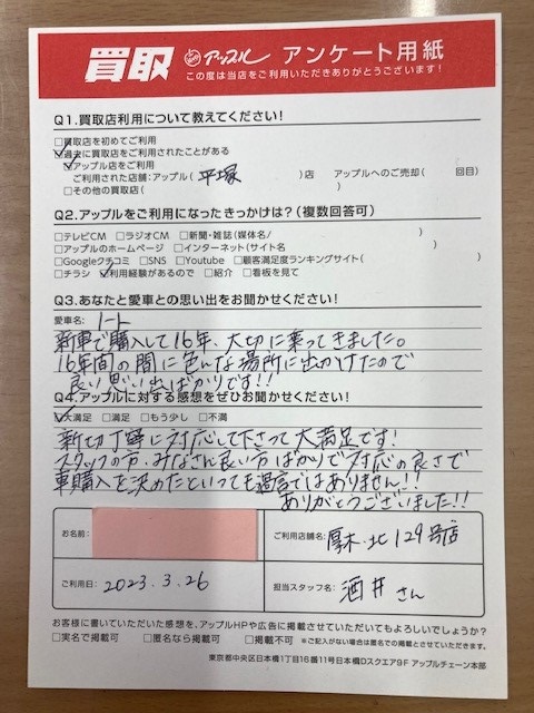 お車のご相談・ 査定だけでもOK! カンタン 入力 30秒 アップルがブランド買取始めました! お電話でも受付中! 受付時間10:00 ~ 19:00 046-246-2828 お車のご相談・ 査定だけでもOK! カンタン 入力 30秒 アップルがブランド買取始めました! お電話でも受付中! 受付時間10:00 ~ 19:00 046-246-2828 アップルがブランド買取始めました! お電話でも受付中! 受付時間10:00 ~ 19:00 046-246-2828 店舗情報 在庫車 スタッフ紹介 ブログ お客様の声 キャンペーン 無料査定 click お客様の声 ご記入日: 2023/03/26 海老名市 N様 車名:日産 ノート 親切丁寧に対応して下さって大満足です!スタッフの方、みなさん良い方ばかりで対応の良さで車の購入を決めたといっても過言ではありません!!ありがとうございました!! 前へ 次へ お客様の声一覧を見る