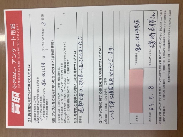 お車のご相談・ 査定だけでもOK! カンタン 入力 30秒 アップルがブランド買取始めました! お電話でも受付中! 受付時間10:00 ~ 19:00 046-246-2828 お車のご相談・ 査定だけでもOK! カンタン 入力 30秒 アップルがブランド買取始めました! お電話でも受付中! 受付時間10:00 ~ 19:00 046-246-2828 アップルがブランド買取始めました! お電話でも受付中! 受付時間10:00 ~ 19:00 046-246-2828 店舗情報 在庫車 スタッフ紹介 ブログ お客様の声 キャンペーン 無料査定 click お客様の声 ご記入日: 2023/05/18 厚木市 S様 車名:スバル ステラ 通勤で毎日、頑張って走ってくれました!いつも丁寧な接客をありがとうございます! 前へ 次へ お客様の声一覧を見る