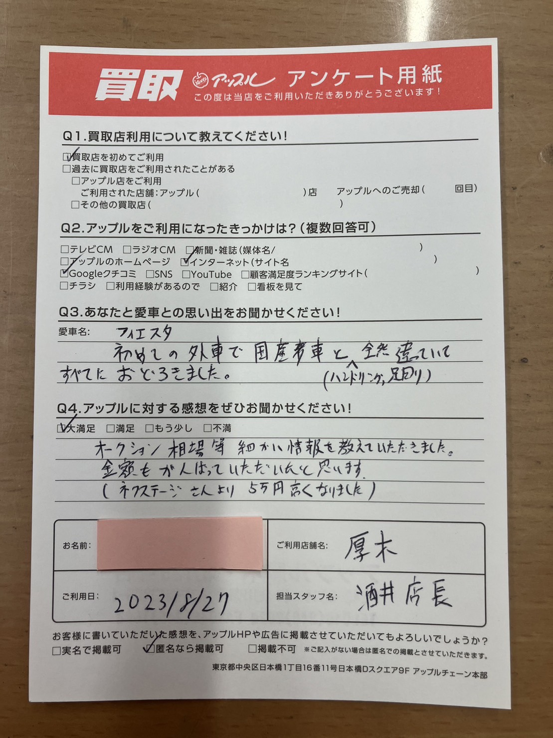 お車のご相談・ 査定だけでもOK! カンタン 入力 30秒 アップルがブランド買取始めました! お電話でも受付中! 受付時間10:00 ~ 19:00 046-246-2828 お車のご相談・ 査定だけでもOK! カンタン 入力 30秒 アップルがブランド買取始めました! お電話でも受付中! 受付時間10:00 ~ 19:00 046-246-2828 アップルがブランド買取始めました! お電話でも受付中! 受付時間10:00 ~ 19:00 046-246-2828 店舗情報 在庫車 スタッフ紹介 ブログ お客様の声 キャンペーン 無料査定 click お客様の声 ご記入日: 2023/08/27 厚木市 Y様 車名:フォード フィエスタ オークション相場等細かい情報を教えていただきました。金額も頑張っていただいたと思います。 前へ 次へ お客様の声一覧を見る