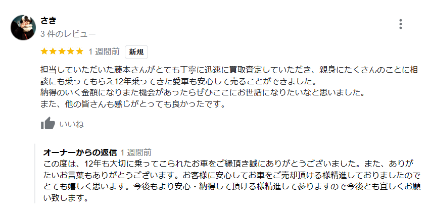 担当していただいた藤本さんがとても丁寧に迅速に買い取り査定していただき、親身にたくさんのことに相談にも乗ってもらえ12年乗ってきた愛車も安心して売ることが出来ました。納得のいく金額になりまた機会があったらぜひここにお世話になりたいと思いました。また、他の皆さんも感じがとっても良かったです。