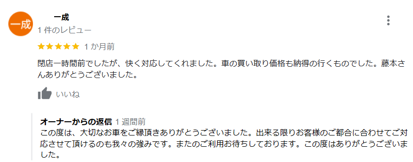 お車のご相談・ 査定だけでもOK! カンタン 入力 30秒 アップルがブランド買取始めました! お電話でも受付中! 受付時間AM10:00~PM7:00(毎週水曜日店休) 052-304-0136 お車のご相談・ 査定だけでもOK! カンタン 入力 30秒 アップルがブランド買取始めました! お電話でも受付中! 受付時間AM10:00~PM7:00(毎週水曜日店休) 052-304-0136 アップルがブランド買取始めました! お電話でも受付中! 受付時間AM10:00~PM7:00(毎週水曜日店休) 052-304-0136 店舗情報 在庫車 スタッフ紹介 ブログ お客様の声 キャンペーン 無料査定 click お客様の声 ご記入日: 2023/05/01 一成様 閉店一時間前でしたが、快く対応してくれました。車の買い取り価格も納得の行くものでした。藤本さんありがとうございました。 前へ 次へ お客様の声一覧を見る