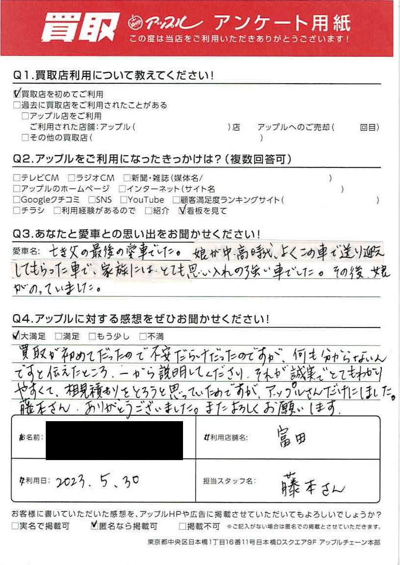 買取が初めてだったので不安だらけだったのですが、何も分からないんですと伝えたところ、一から説明してくださり、それが誠実でとてもわかりやすくて相見積もりをとろうと思っていたのですがアップルさんだけにしました。