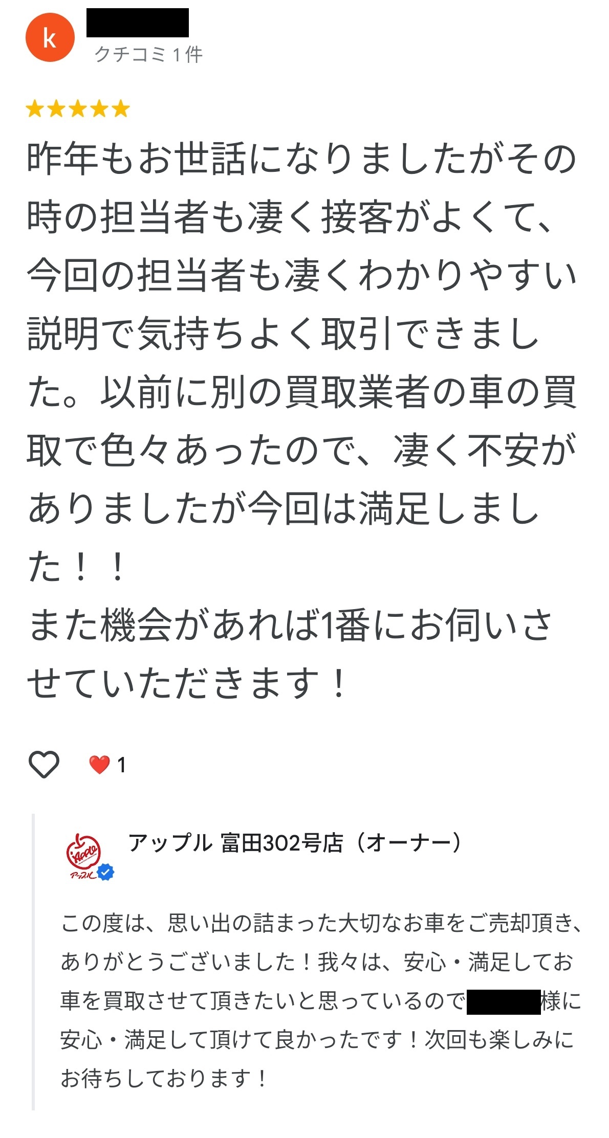 昨年もお世話になりましたがその時の担当者も凄く接客がよくて、今回の担当者も凄くわかりやすい説明で気持ち良く取引できました。以前に別の買取業者の車の買取で色々あったので、凄く不安がありましたが今回は、満足しました!!また機会があれば1番にお伺いさせていただきます。