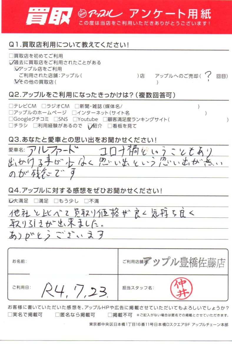 お車のご相談・ 査定だけでもOK! カンタン 入力 30秒 アップルがブランド買取始めました! お電話でも受付中! 受付時間10:00 ~ 19:00 0532-64-5911 お車のご相談・ 査定だけでもOK! カンタン 入力 30秒 アップルがブランド買取始めました! お電話でも受付中! 受付時間10:00 ~ 19:00 0532-64-5911 アップルがブランド買取始めました! お電話でも受付中! 受付時間10:00 ~ 19:00 0532-64-5911 店舗情報 在庫車 スタッフ紹介 ブログ お客様の声 キャンペーン 無料査定 click お客様の声 ご記入日: 2022/07/23 愛知県 匿名希望様 車名:トヨタ アルファード(H27年1月~のHYBRID含む) 他社と比べて買取り価格が良く気持ち良く取り引きができました。ありがとうございます。 前へ 次へ お客様の声一覧を見る