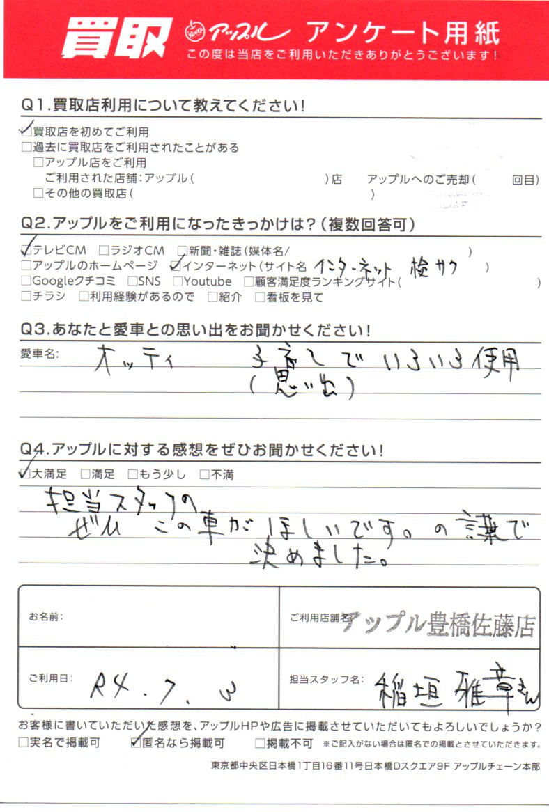 お車のご相談・ 査定だけでもOK! カンタン 入力 30秒 アップルがブランド買取始めました! お電話でも受付中! 受付時間10:00 ~ 19:00 0532-64-5911 お車のご相談・ 査定だけでもOK! カンタン 入力 30秒 アップルがブランド買取始めました! お電話でも受付中! 受付時間10:00 ~ 19:00 0532-64-5911 アップルがブランド買取始めました! お電話でも受付中! 受付時間10:00 ~ 19:00 0532-64-5911 店舗情報 在庫車 スタッフ紹介 ブログ お客様の声 キャンペーン 無料査定 click お客様の声 ご記入日: 2022/07/03 愛知県 匿名希望様 車名:日産 オッティ 担当スタッフのぜひこの車がほしいです。の言葉で決めました。 前へ 次へ お客様の声一覧を見る
