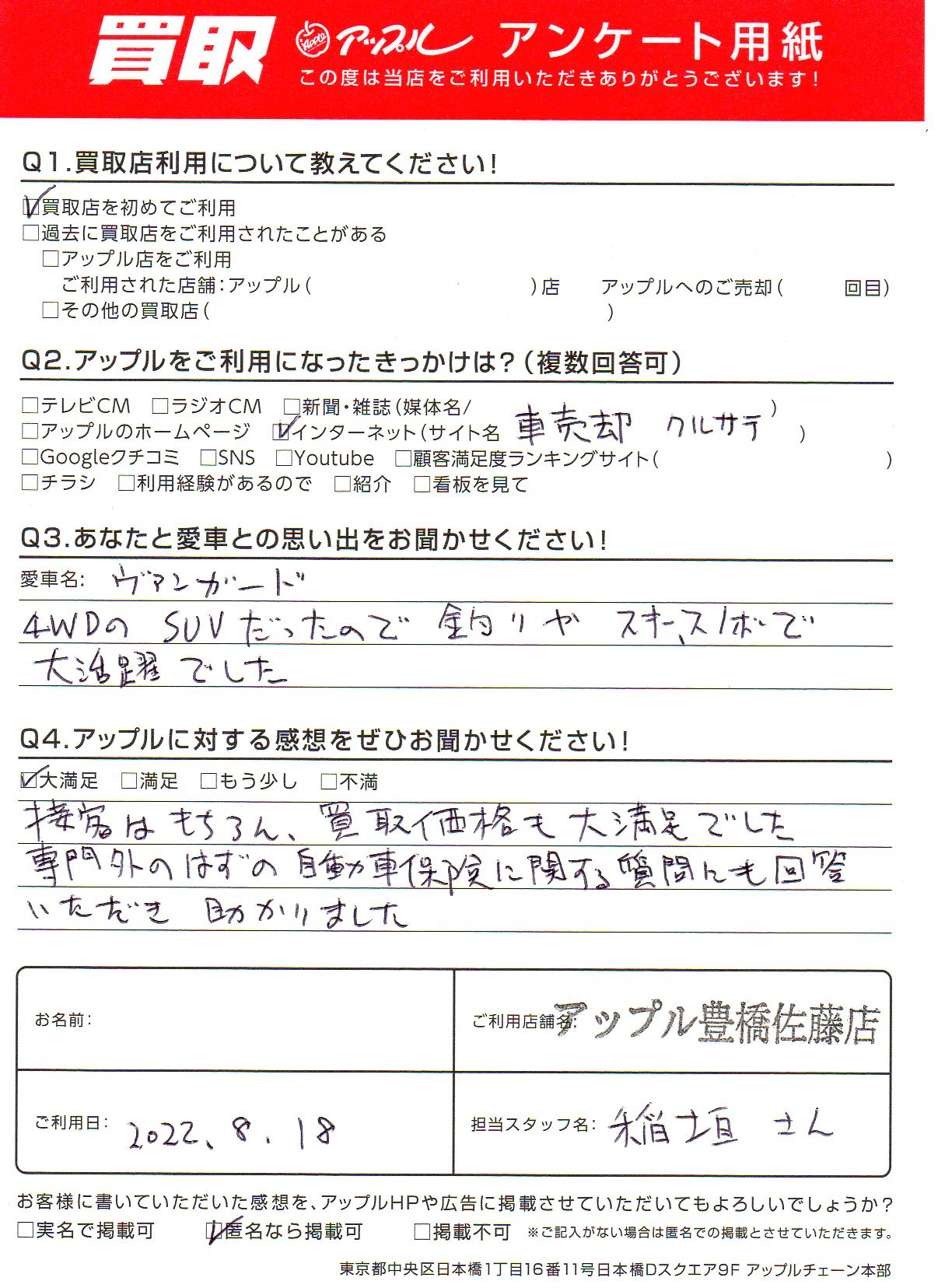 お車のご相談・ 査定だけでもOK! カンタン 入力 30秒 アップルがブランド買取始めました! お電話でも受付中! 受付時間10:00 ~ 19:00 0532-64-5911 お車のご相談・ 査定だけでもOK! カンタン 入力 30秒 アップルがブランド買取始めました! お電話でも受付中! 受付時間10:00 ~ 19:00 0532-64-5911 アップルがブランド買取始めました! お電話でも受付中! 受付時間10:00 ~ 19:00 0532-64-5911 店舗情報 在庫車 スタッフ紹介 ブログ お客様の声 キャンペーン 無料査定 click お客様の声 ご記入日: 2022/08/18 愛知県 匿名希望様 車名:トヨタ ヴァンガード 接客はもちろん、買取価格も大満足でした。専門外のはずの自動車保険に関する質問にも回答いただき、助かりました。 前へ 次へ お客様の声一覧を見る