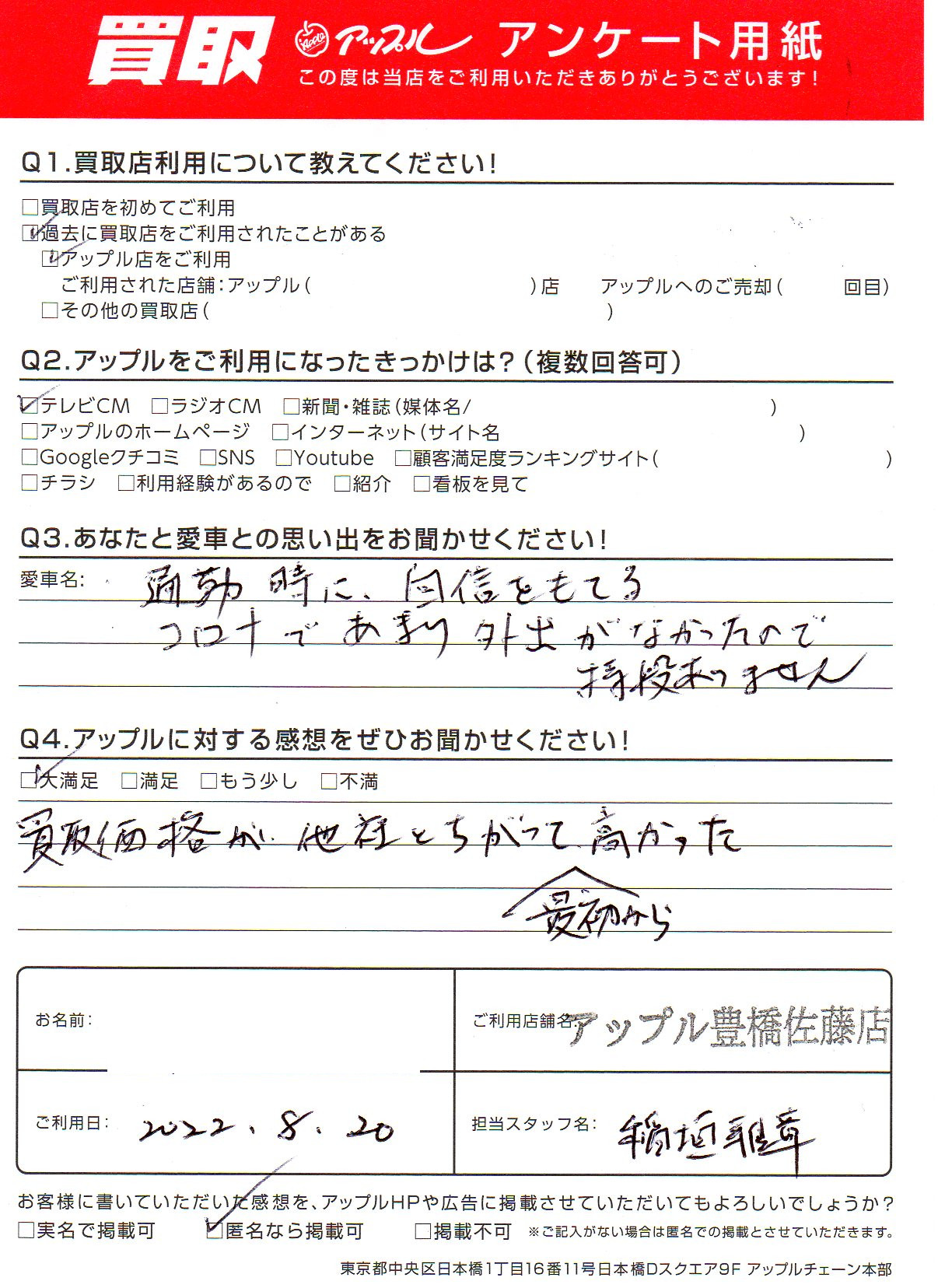 お車のご相談・ 査定だけでもOK! カンタン 入力 30秒 アップルがブランド買取始めました! お電話でも受付中! 受付時間10:00 ~ 19:00 0532-64-5911 お車のご相談・ 査定だけでもOK! カンタン 入力 30秒 アップルがブランド買取始めました! お電話でも受付中! 受付時間10:00 ~ 19:00 0532-64-5911 アップルがブランド買取始めました! お電話でも受付中! 受付時間10:00 ~ 19:00 0532-64-5911 店舗情報 在庫車 スタッフ紹介 ブログ お客様の声 キャンペーン 無料査定 click お客様の声 ご記入日: 2022/08/20 愛知県 匿名希望様 買取価格が他社とちがって最初から高かった。 前へ 次へ お客様の声一覧を見る