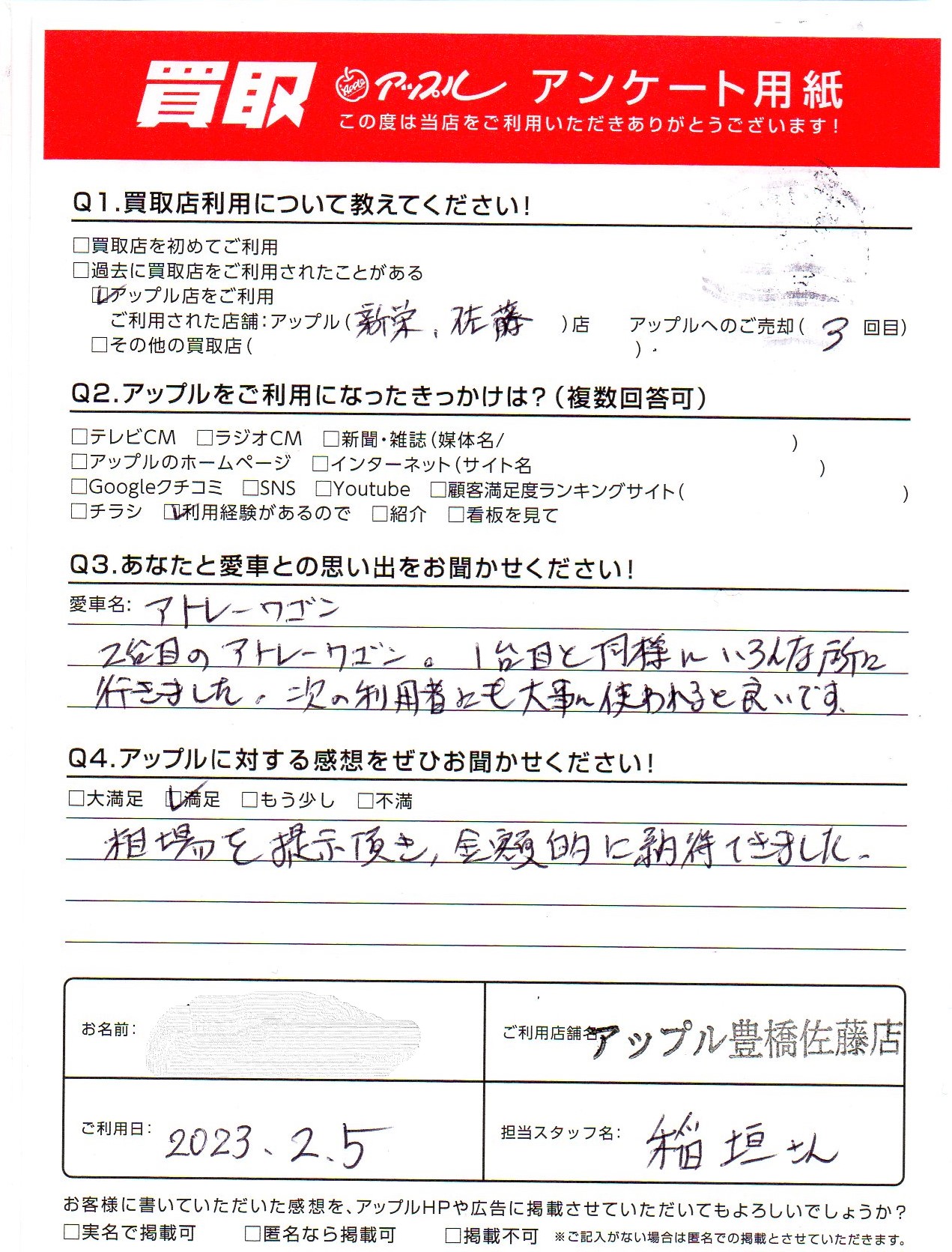 お車のご相談・ 査定だけでもOK! カンタン 入力 30秒 アップルがブランド買取始めました! お電話でも受付中! 受付時間10:00 ~ 19:00 0532-64-5911 お車のご相談・ 査定だけでもOK! カンタン 入力 30秒 アップルがブランド買取始めました! お電話でも受付中! 受付時間10:00 ~ 19:00 0532-64-5911 アップルがブランド買取始めました! お電話でも受付中! 受付時間10:00 ~ 19:00 0532-64-5911 店舗情報 在庫車 スタッフ紹介 ブログ お客様の声 キャンペーン 無料査定 click お客様の声 ご記入日: 2023/02/05 匿名希望様 車名:ダイハツ アトレーワゴン 相場を提示頂き、金銭的に納得できました。 前へ 次へ お客様の声一覧を見る