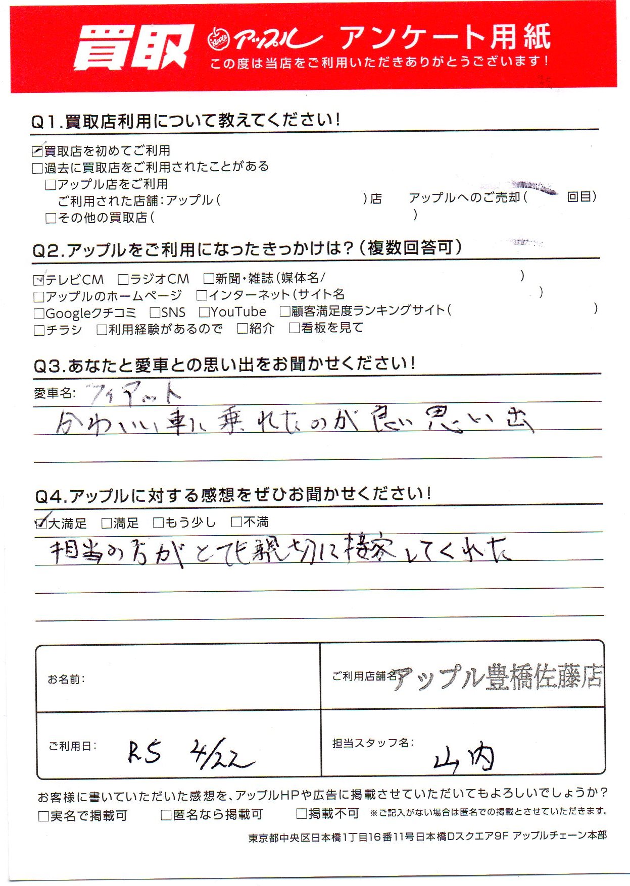 お車のご相談・ 査定だけでもOK! カンタン 入力 30秒 アップルがブランド買取始めました! お電話でも受付中! 受付時間10:00 ~ 19:00 0532-64-5911 お車のご相談・ 査定だけでもOK! カンタン 入力 30秒 アップルがブランド買取始めました! お電話でも受付中! 受付時間10:00 ~ 19:00 0532-64-5911 アップルがブランド買取始めました! お電話でも受付中! 受付時間10:00 ~ 19:00 0532-64-5911 店舗情報 在庫車 スタッフ紹介 ブログ お客様の声 キャンペーン 無料査定 click お客様の声 ご記入日: 2023/04/22 匿名希望様 車名:フィアット 担当の方がとても親切に接客してくれた 前へ 次へ お客様の声一覧を見る
